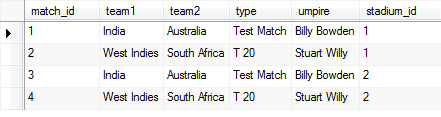 Let’s play with the same example we discussed in Section 19.2 and insert some associations in tables using below program. Run this program twice so that we will have 2 stadiums and 4 matches.