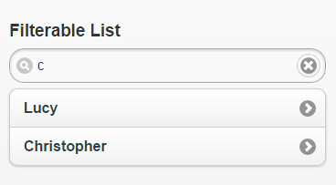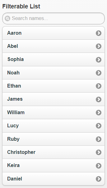 <!DOCTYPE html> <html> <head> <title>Sample Code</title> <link rel="stylesheet" href="http://code.jquery.com/mobile/1.3.2/jquery.mobile-1.3.2.min.css" /> <script src="http://code.jquery.com/jquery-1.9.1.min.js"></script> <script src="http://code.jquery.com/mobile/1.3.2/jquery.mobile-1.3.2.min.js"></script> </head> <body> <div data-role="page" id="lists"> <div data-role="content"> <h3>Filterable List</h3> <ul data-role="listview" data-filter="true" data-filter-placeholder="Search names..." data-inset="true"> <li><a href="#">Aaron</a></li> <li><a href="#">Abel</a></li> <li><a href="#">Sophia</a></li> <li><a href="#">Noah</a></li> <li><a href="#">Ethan</a></li> <li><a href="#">James</a></li> <li><a href="#">William</a></li> <li><a href="#">Lucy</a></li> <li><a href="#">Ruby</a></li> <li><a href="#">Christopher</a></li> <li><a href="#">Keira</a></li> <li><a href="#">Daniel</a></li> </ul> </div> </div> </body> </html>