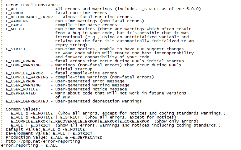 Error_reporting=E_ALL setting will display all types of errors. We must configure this setting as:
