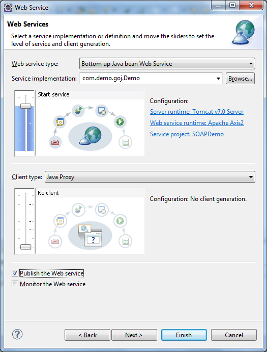 Now your setting in the Web Service screen should be like the following. Select “Publish the Web Service” and click Finish.