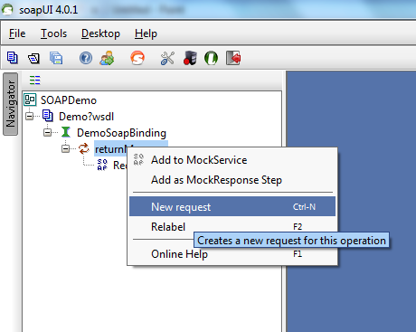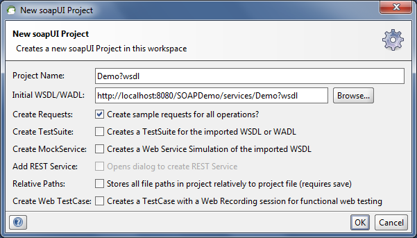 Open SOAP UI and Create a new project with the WSDL from our service: http://localhost:8080/SOAPDemo/services/Demo?wsdl.