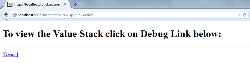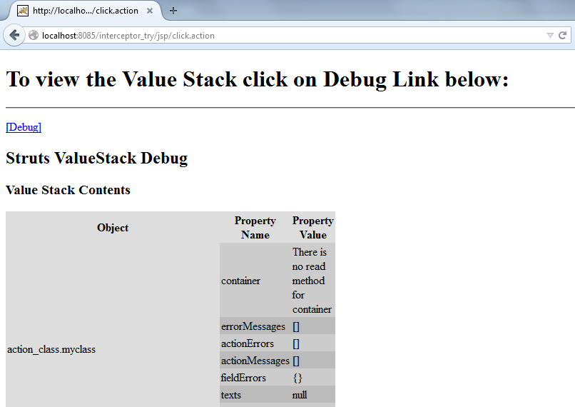 - Our web application only submits a form and on submission of action, displays the “debug link”. On click of debug link (<s:debug/> tag) all the stack elements (objects) with their values are displayed in tabular format.