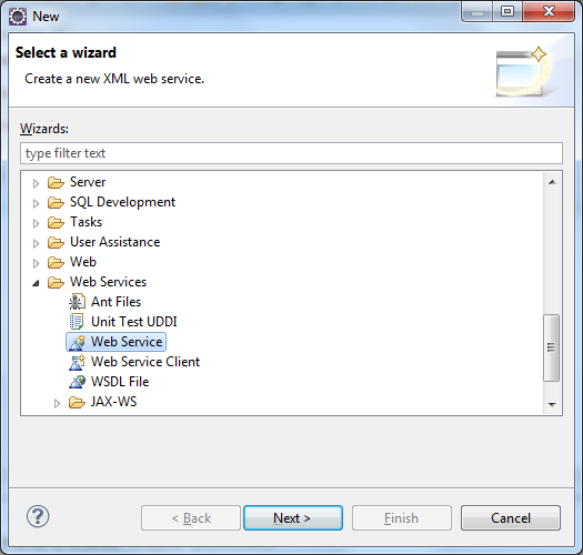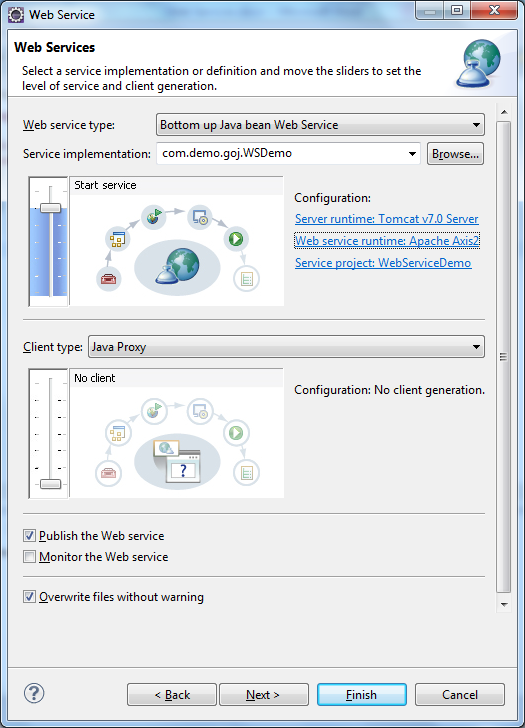 You should see the Web Service screen. Here le’ts select the class we created so it is exposed as a web service, in our case the WSDemo.java class, so let’s reference it by the fully qualified class name: com.demo.goj.WSDemo.