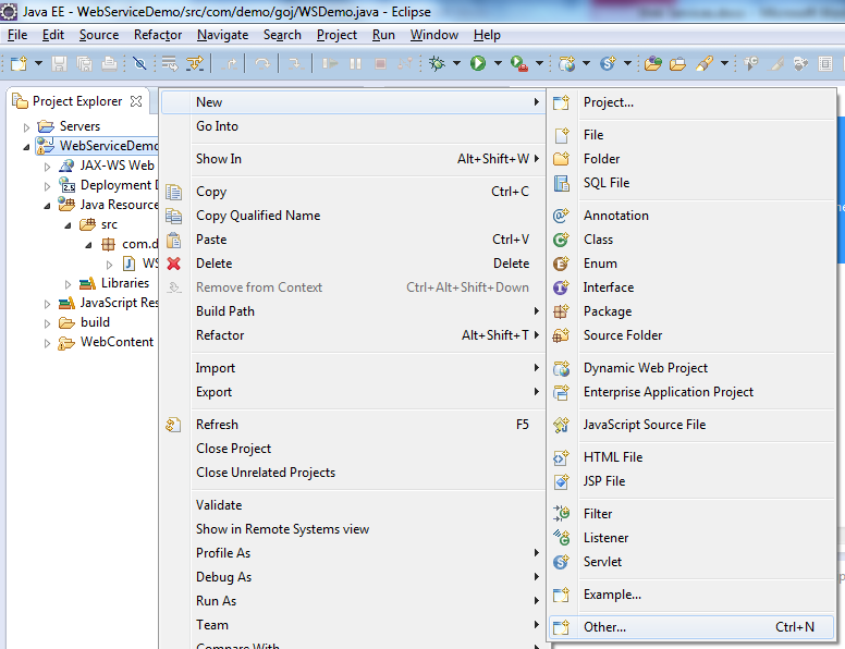 Now that we have our web service demo project in place, let’s start creating our initial class. Right click on the source folder and create a new class, called WSDemo and click Finish.