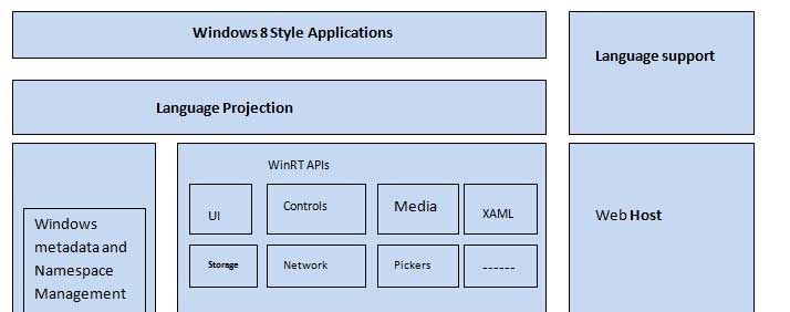 Windows 8 supports windows store application development, which is totally new kind of applications. From the developers point of view Windows 8 platform architecture can be shown using following diagram: